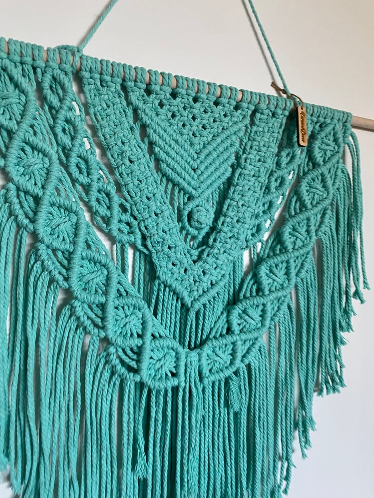 Beautiful macrame wall hanging on 24” wide wood dowel. Approx. 34” from top of hanging cord to bottom fringe. A gorgeous addition to any room or space. Makes a great gift! 24” W x 34” L Related: Boho wall hanging Boho chic Boho decor Minimalist Colorful macrame Yarn wall hanging Crochet Handmade macrame Aqua macrame