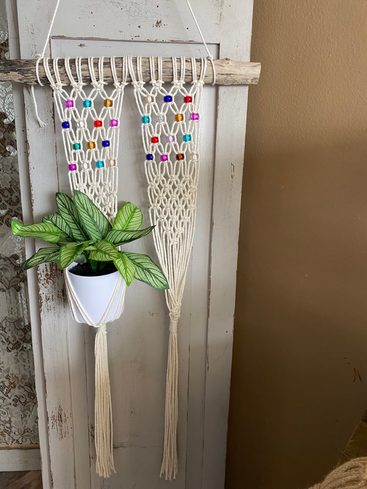 Beaded double plant hanger on 17.5” wide natural driftwood. Approx. 43” long from top of hanging cord to bottom fringe. Colorful glass beads. One of a kind piece. *** ships from Los Angeles, CA *** Related: Minimalist Boho plant hanger Boho decor Plant holder Garden decor Fairy garden Macrame wall hanging Macrame plant hanger Glass beads