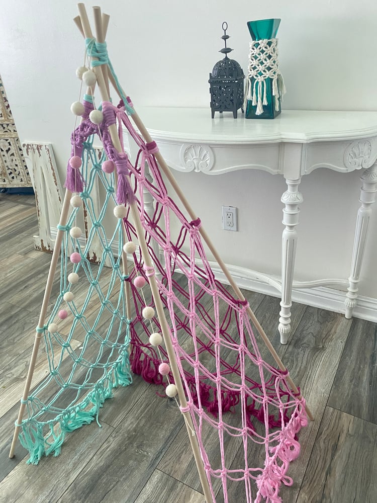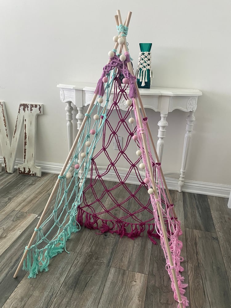 This whimsical “unicorn” macrame tent can be used for parties, photo props, bedroom decor and more. Wooden dowels are 48” and stand at approx. 43.5” when set up, bottom width opening is approx. 39” when set up. Complete with felt pompoms accents. Tags: Boho party Boho garden Fairy garden Unicorn party Unicorn decor Rainbow tent Tea party Boho theme Unicorn party