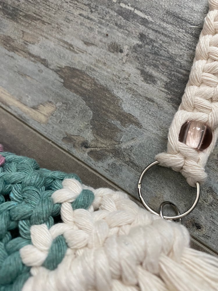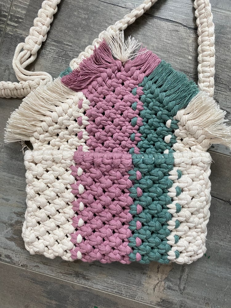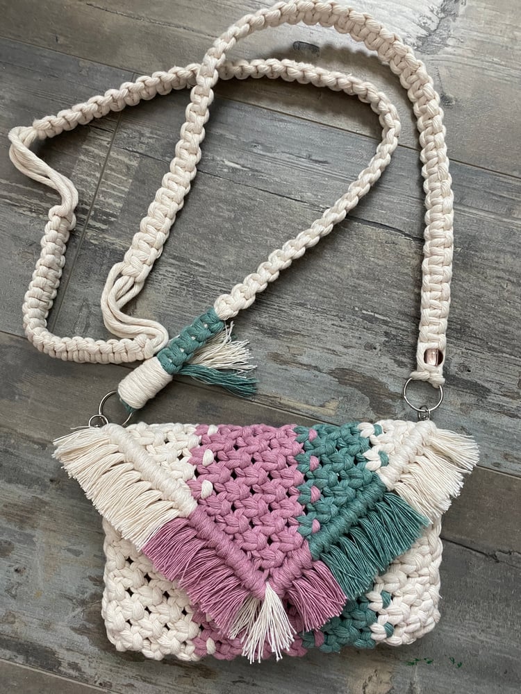 This handmade bag is versatile, can be used as a crossbody, on the shoulder or clutch. Removable strap has a light pink glass bead. Measurements: 8.5” wide 5” tall Strap is approx. 59”